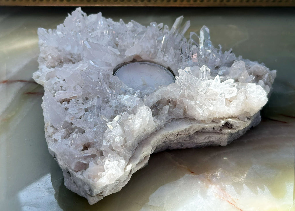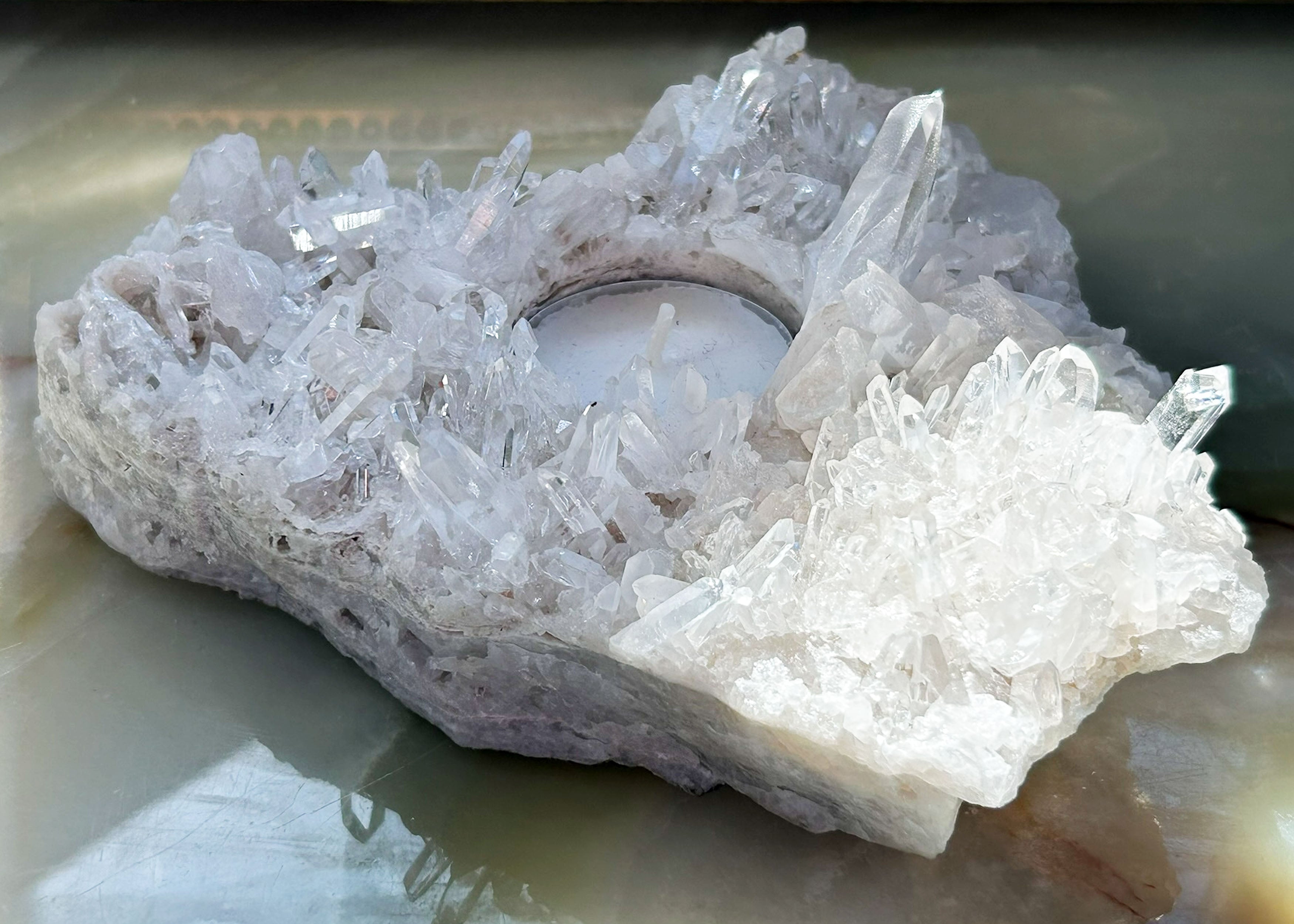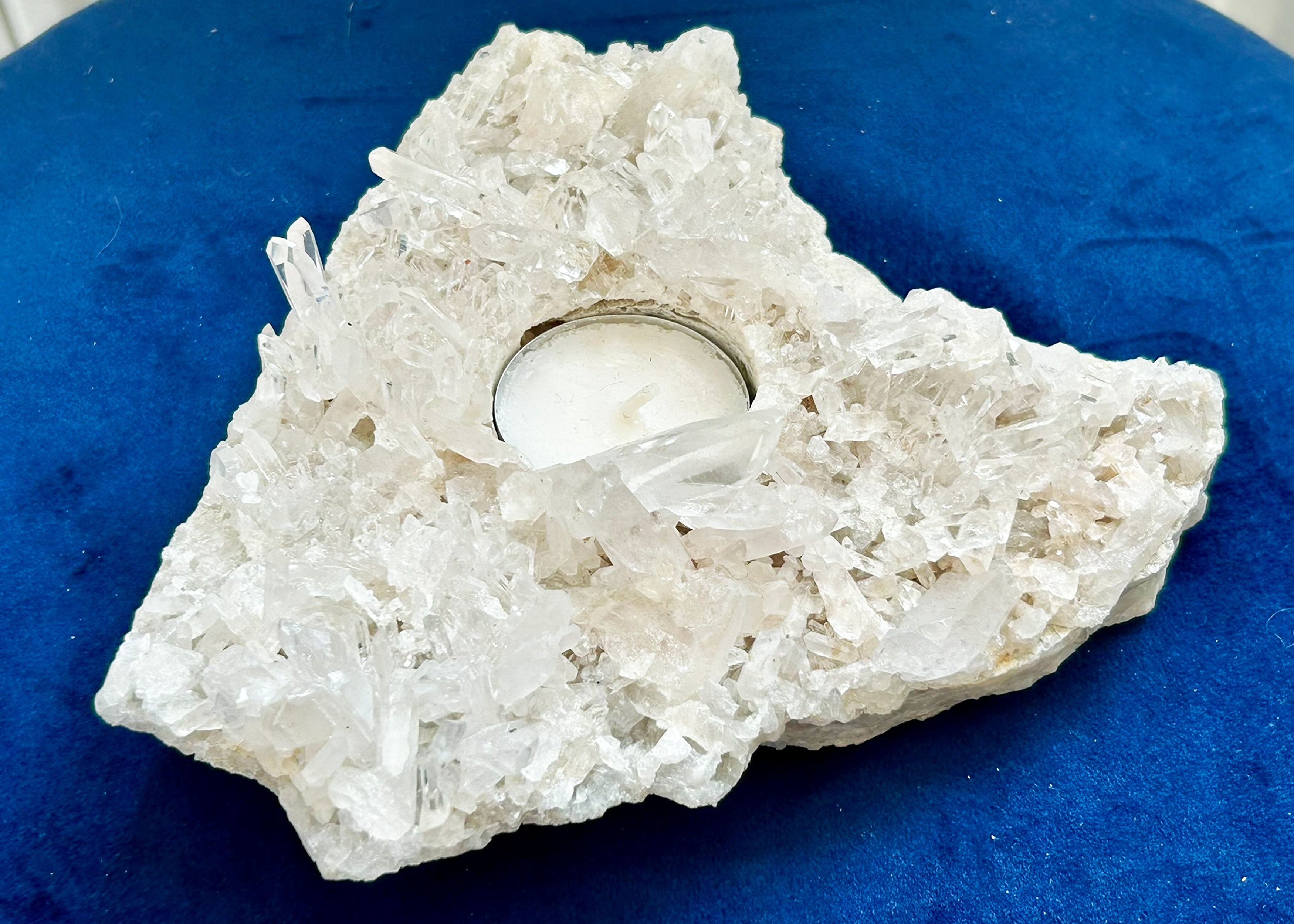 This impressive Clear Quartz cluster functions as an elegant candle holder whilst doubling as a natural mineral specimen. The crystalline structure provides a stable, aesthetically refined base for standard tealight candles, with light refracting beautifully through the transparent Quartz.