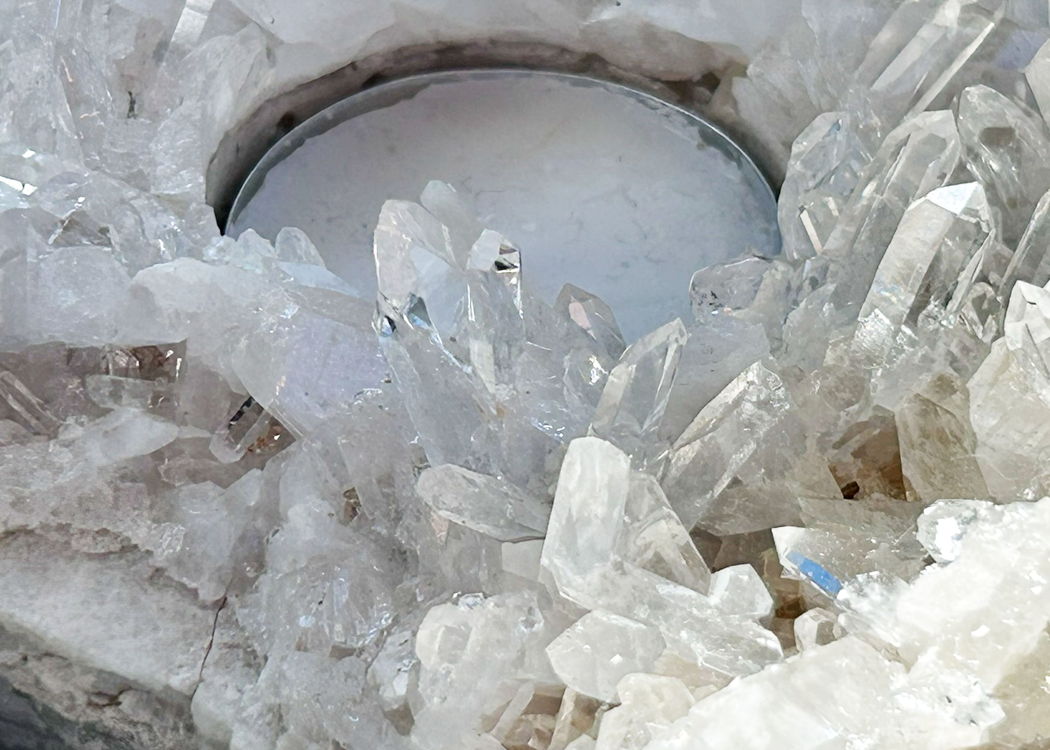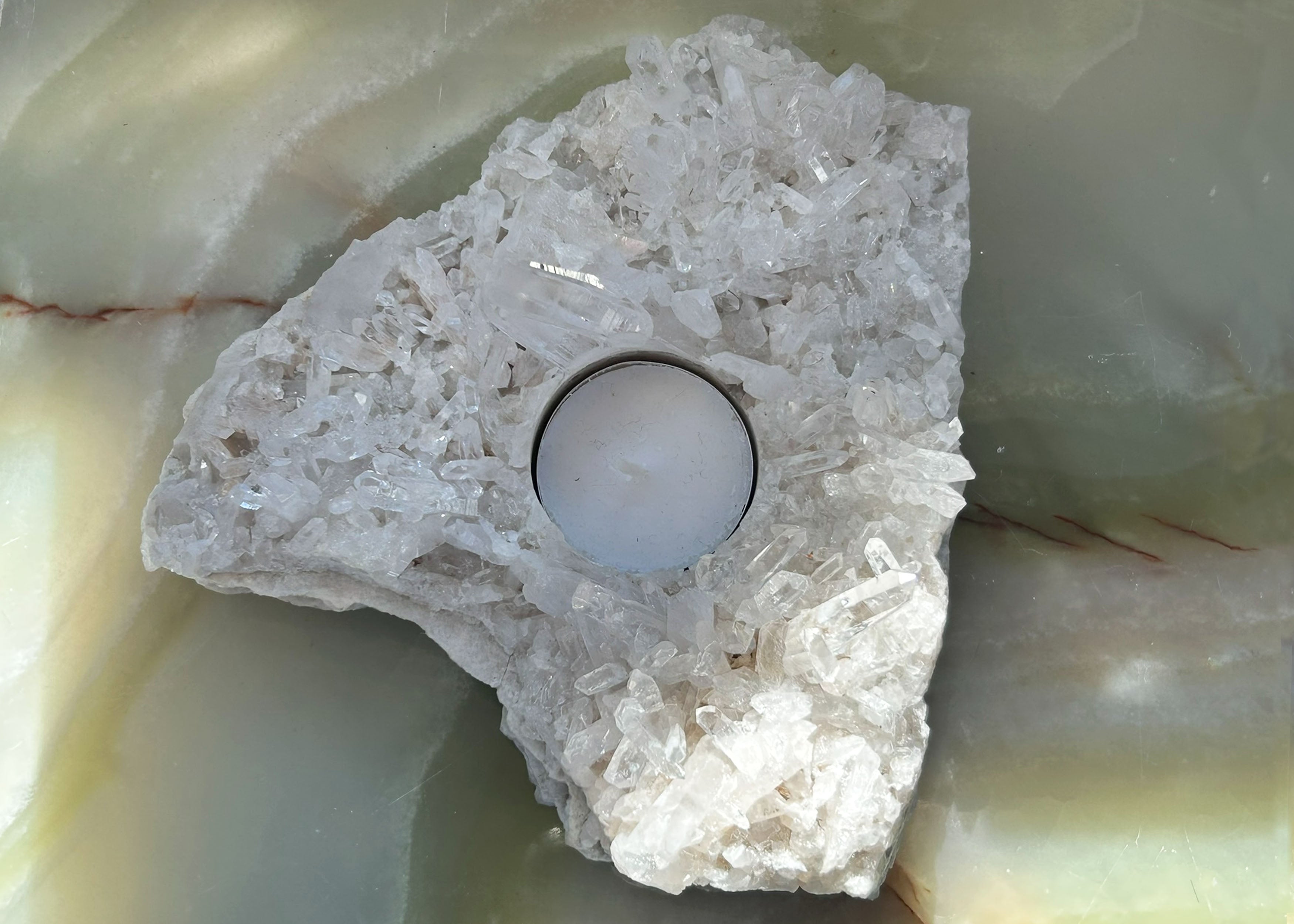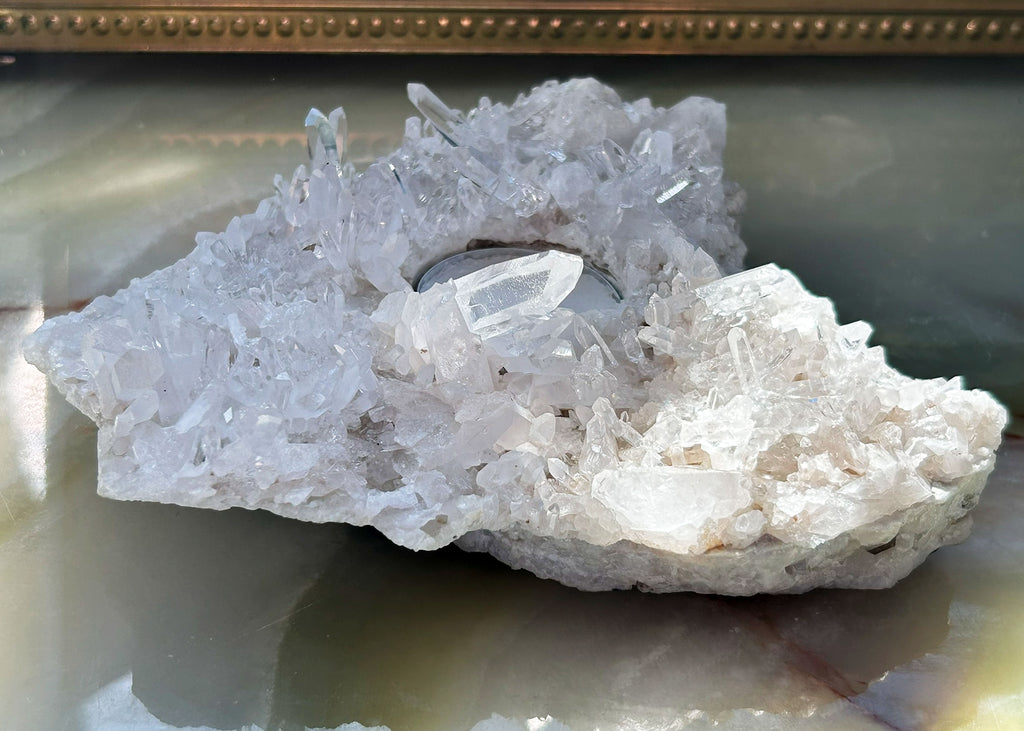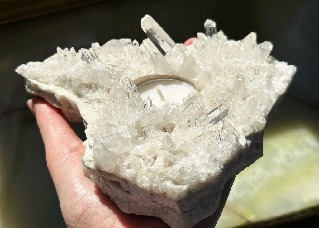 This impressive Clear Quartz cluster functions as an elegant candle holder whilst doubling as a natural mineral specimen. The crystalline structure provides a stable, aesthetically refined base for standard tealight candles, with light refracting beautifully through the transparent Quartz.
