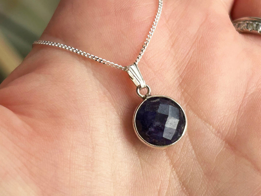 A beautiful Sterling silver bezel set faceted Sapphire (dyed/enhanced) round pendant, presented on an 18 inch, Sterling Silver fine curb chain.